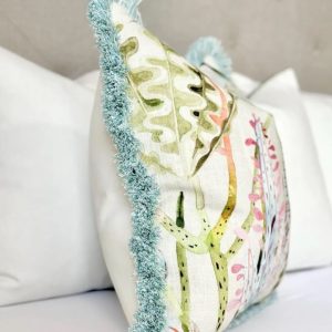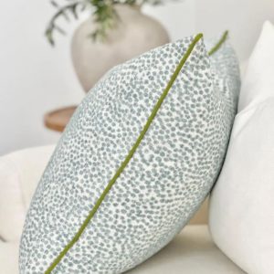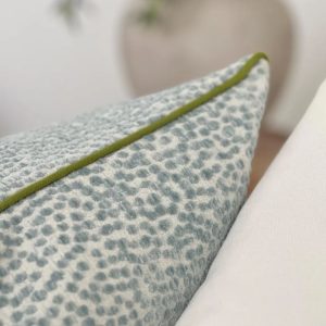 Seaglass velvet Throw Pillow with Green Trim detail | Designer seaglass pillow for sofa and bed | Light blue accent pillow cover 16×16 inches