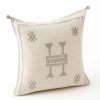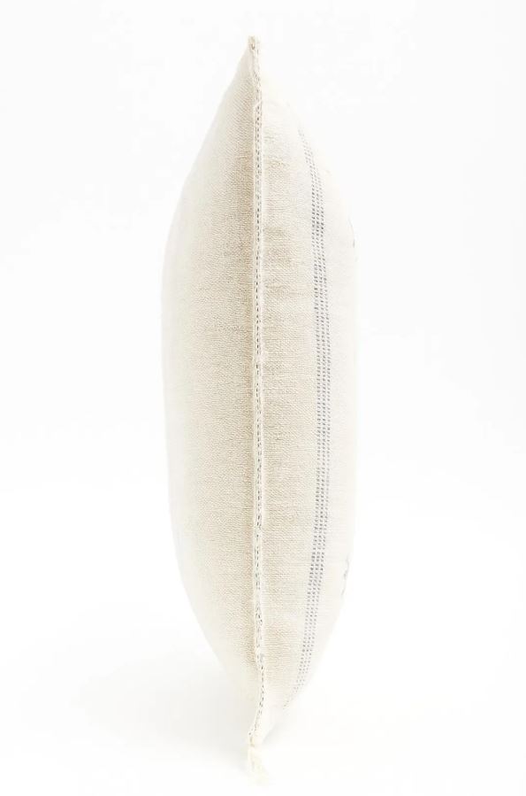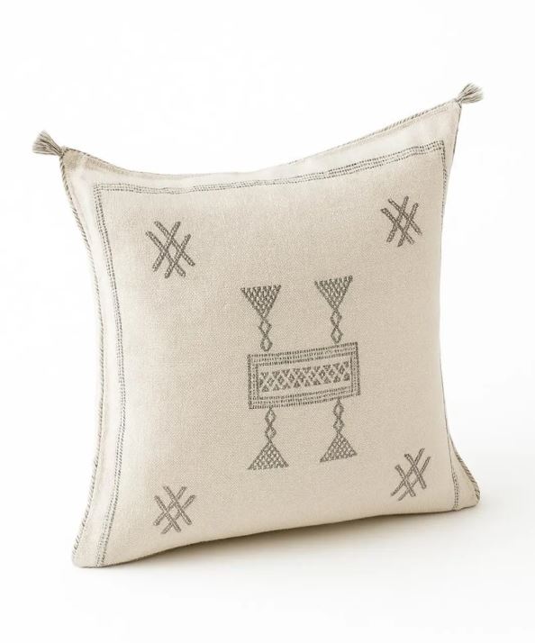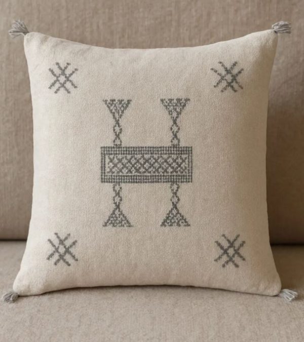 This handcrafted Moroccan Berber pillow features intricate geometric embroidery in a minimalist grey thread on a natural off-white background. Made from handwoven wool or cotton, the design incorporates traditional Berber motifs symbolizing protection and harmony. The pillow’s subtle texture and artisanal detailing make it a unique accent piece for bohemian, rustic, or eclectic interiors. It is displayed against a cozy backdrop of woven textiles, enhancing its warm, handmade appeal.