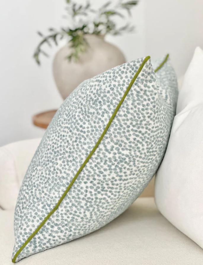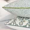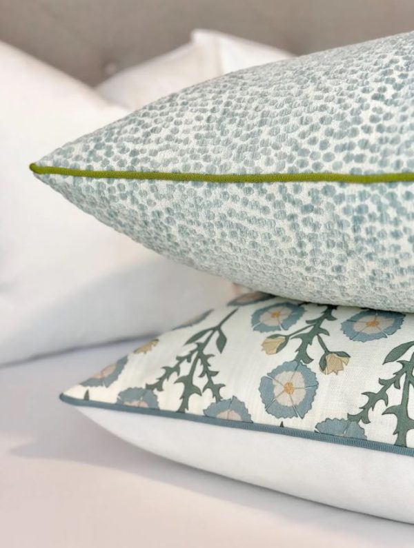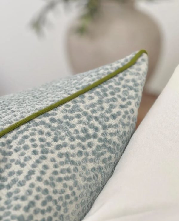 Seaglass velvet Throw Pillow with Green Trim detail | Designer seaglass pillow for sofa and bed | Light blue accent pillow cover 16×16 inches